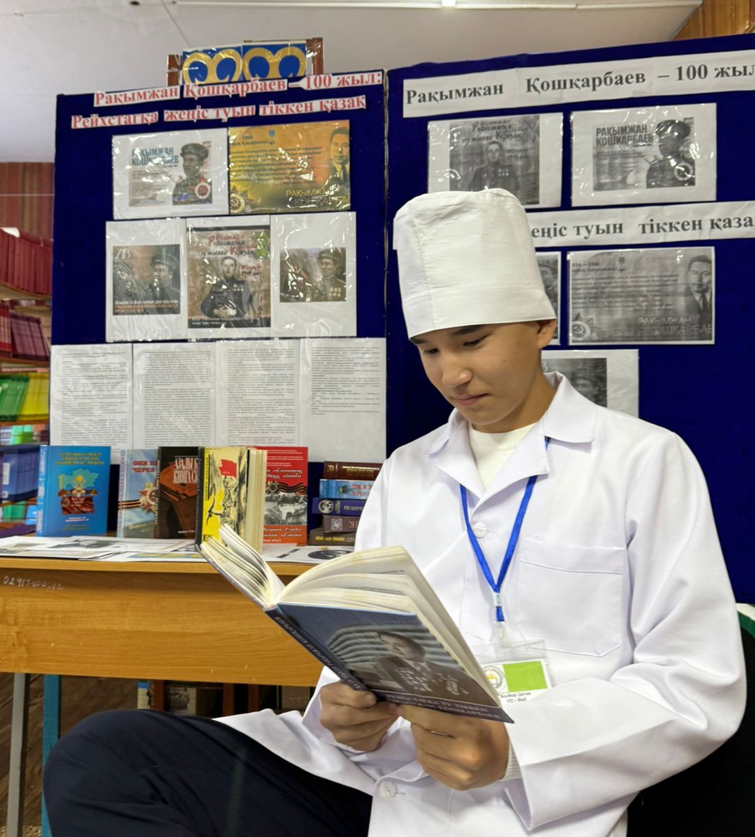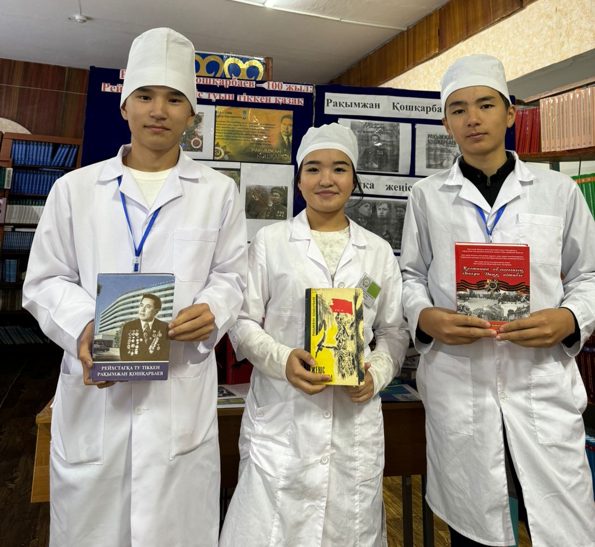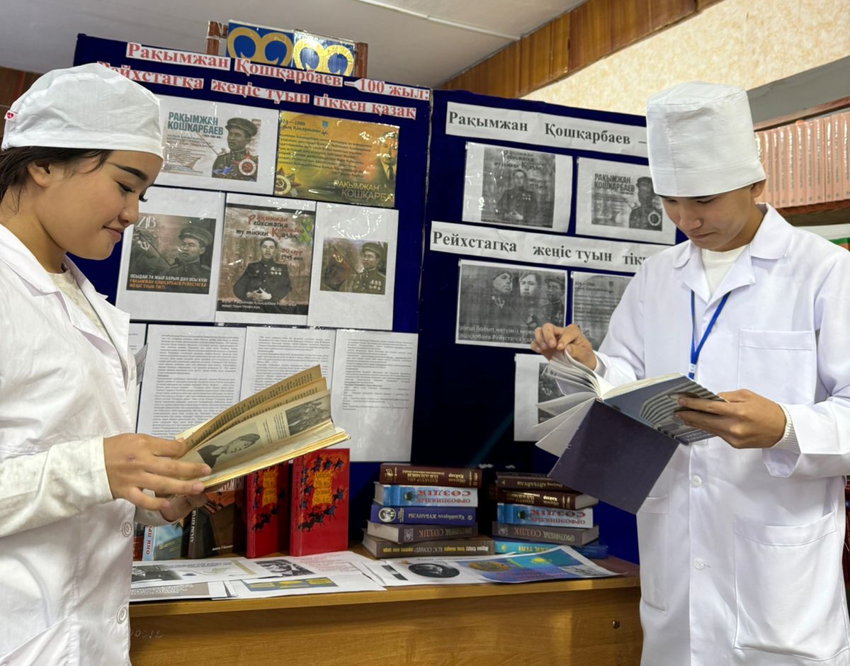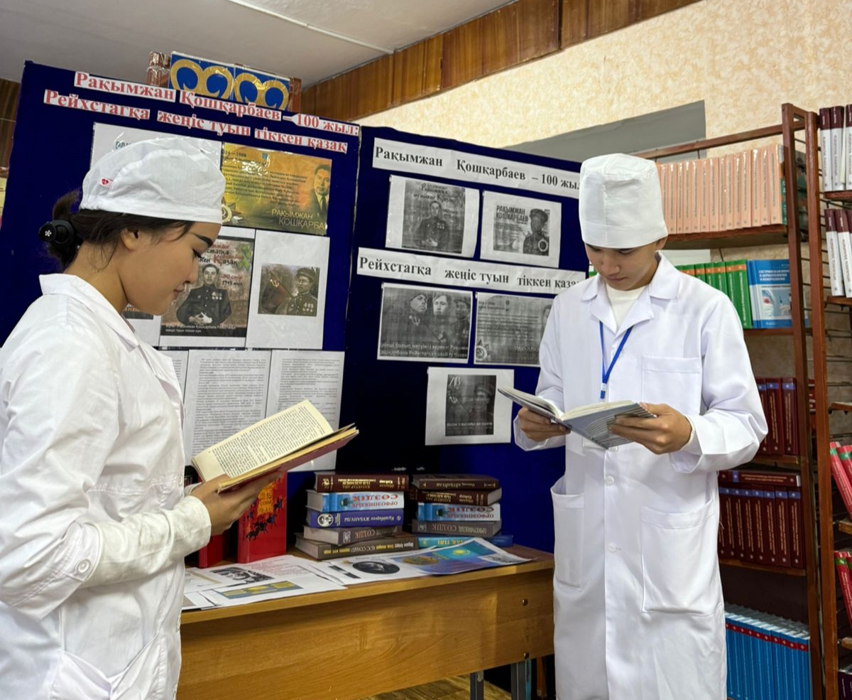 Колледж кітапханасында Рақымжан Қошқарбаевтың 100 жыл толуына орай «Рақымжан Қошқарбаев – 100 жыл: Рейхстагқа жеңіс туын тіккен қазақ» тақырыбында кітаптар көрмесі ұйымдастырылды.