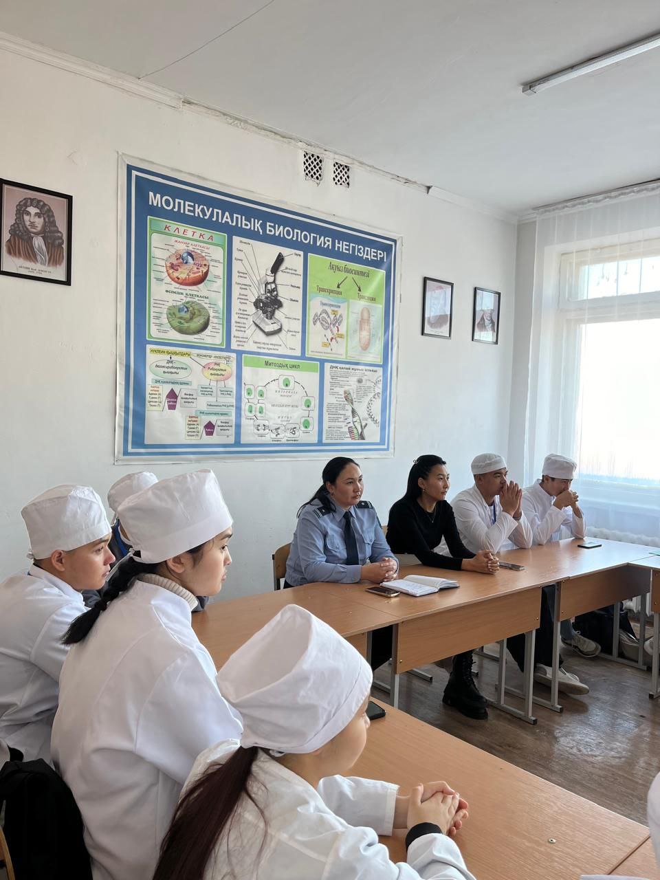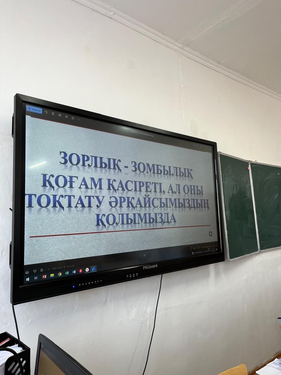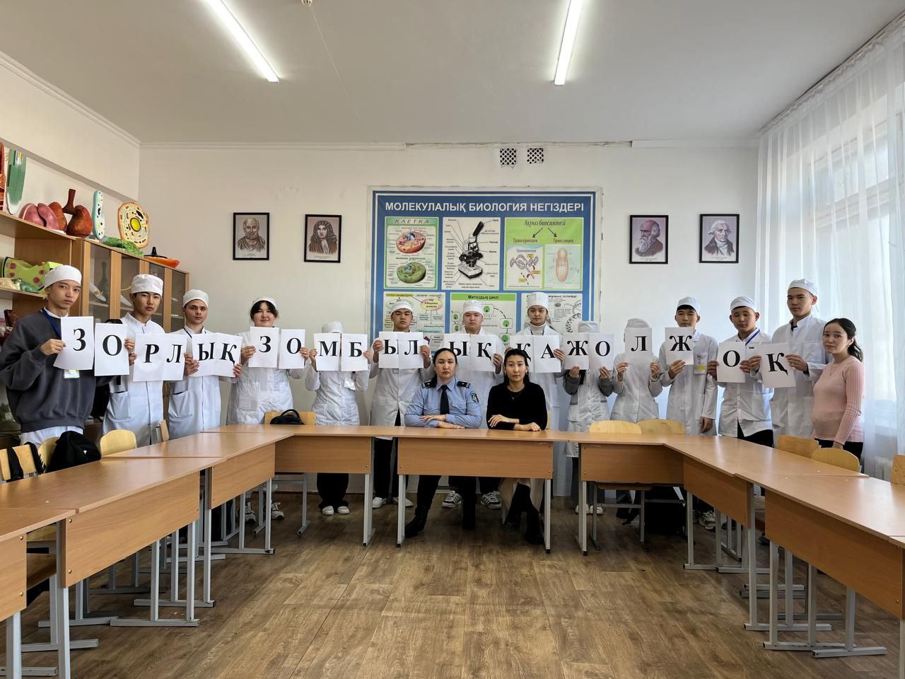 2 курс оқушыларының арасында «Зорлық зомбылыққа жол жоқ» атты кеш өтті. Кеш қонақтары Мейрамкул Жумабекқызы және «Қазақстан» медициналық орталығының терапевт дәрігері Айдана Нурбекқызы шақырылды. Мақсаты: Оқушыларға зорлық зомбылық туралы мағлұмат беру, адамның ең жаман қасиеті екенін айту. Адамның ең басты құндылығы оның бостандығы, олай болса оқушыларға адамзаттық құқықтарымен бас бостандықтарын қорғауы туралы үйрету. Зорлық –зомбылық адам ағзасына тікелей әсер ететінін түсіндіру. Жаман әдеттерден бойларын аулақ ұстап, ондай әрекеттерге бармауға тәрбиелеу, адамгершілігі мол саналы азамат болып өсуіне ықпал жасау.